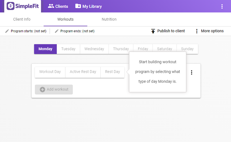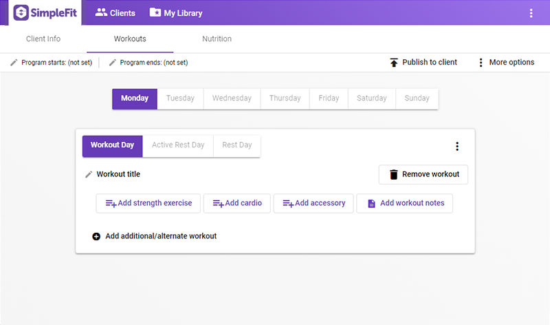 New clients start with an empty workout program and meal plan. Workout program days do not contain any workouts, notes, or even a label as to what kind of day it is (workout day, active rest day or rest day).