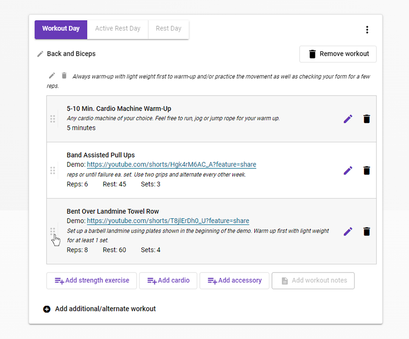 To start building a workout program, click on either the Active Rest Day, Rest Day or Workout Day buttons to designate what kind of day it is. You can only add workouts to days designated as workout days.