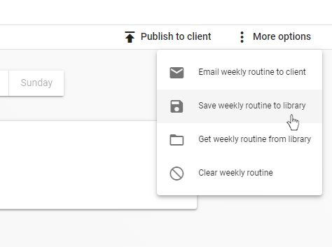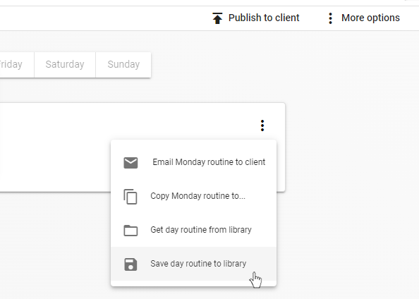 When done you can save the entire workout program or the individual day routines to your library. These options are found under More options (to save the entire workout program) or under the 'more' icon to save the routines for individual days.