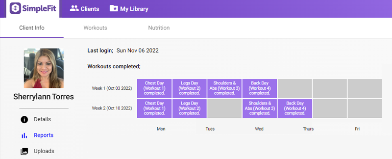 From your dashboard main page, click on a client's name and then chose 'Reports' to see the last time they logged into the SimpleFit client app and which workouts they marked as complete.
